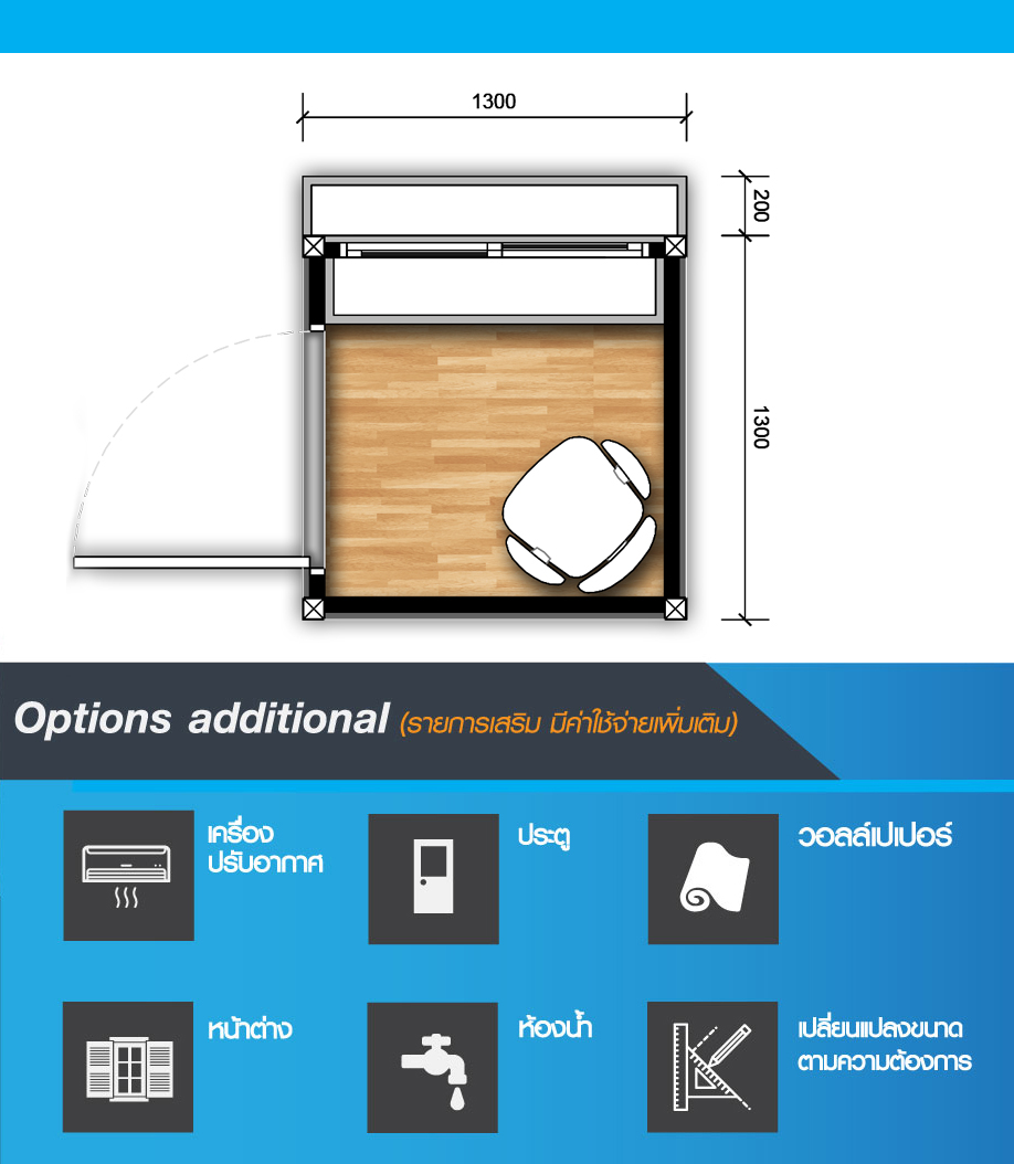 ขนาดบ้าน : 1.30 x 1.30 เมตร พื้นที่ใช้สอย 1.70 ตารางเมตร