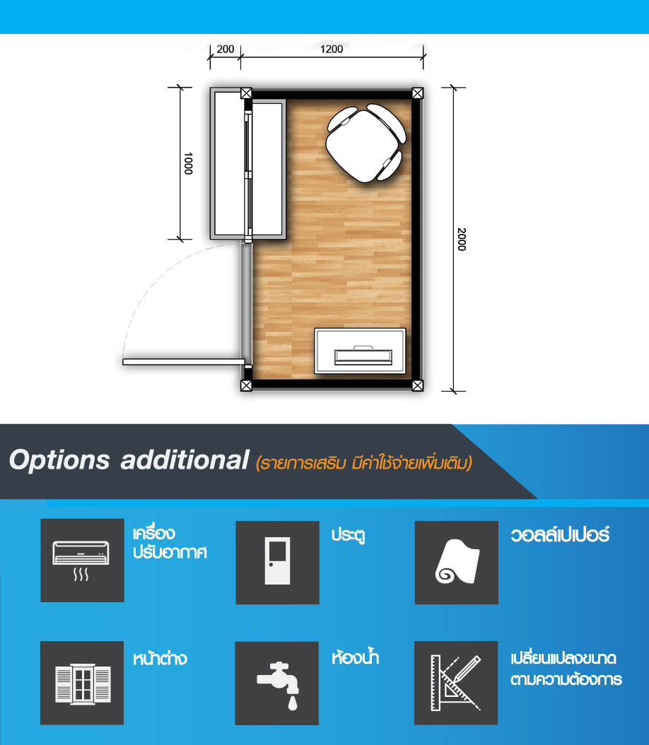 ขนาดบ้าน : 1.20 x 2.00 เมตร พื้นที่ใช้สอยภายใน 2.40 ตารางเมตร