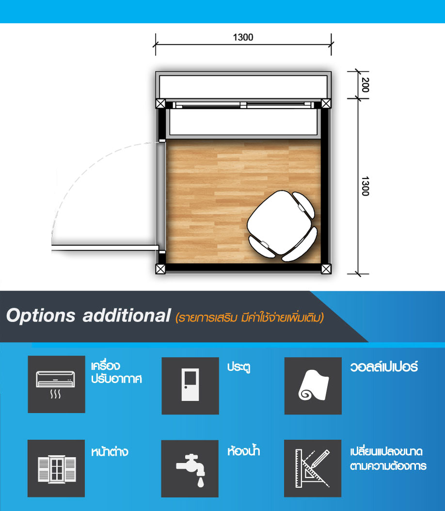 ขนาดบ้าน : 1.30 x 1.30 เมตร พื้นที่ใช้สอย 1.70 ตารางเมตร