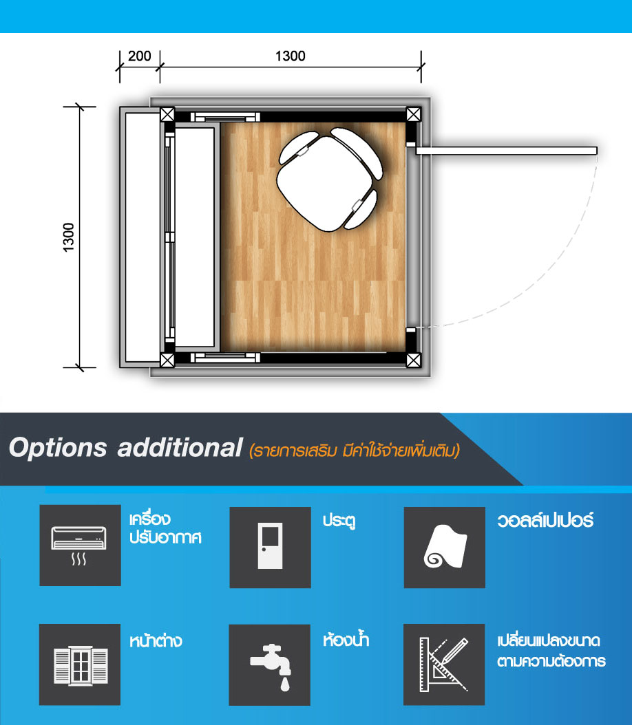 ขนาดบ้าน : 1.30 x 1.30 เมตร พื้นที่ใช้สอย 1.70 ตารางเมตร
