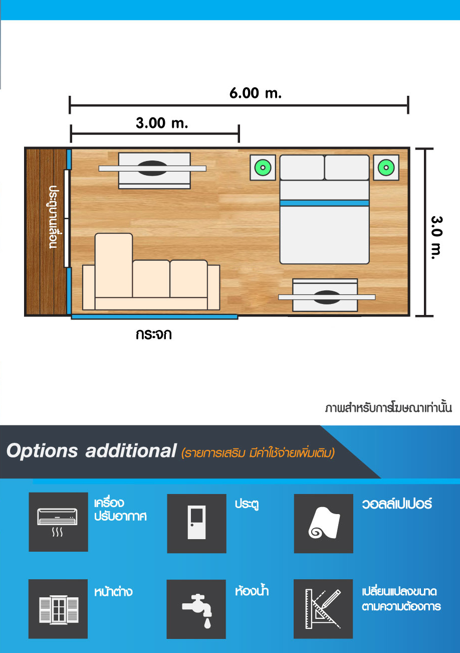 ขนาดบ้าน : 3.00 x 6.00 เมตร พื้นที่ใช้สอย 18.00 ตารางเมตร